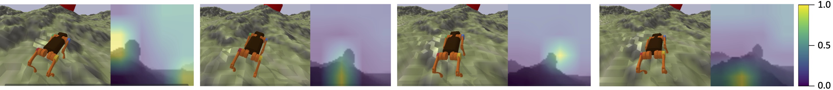 On challenging terrain, the agent attends to the goal destination and the local terrain in an alternative manner.