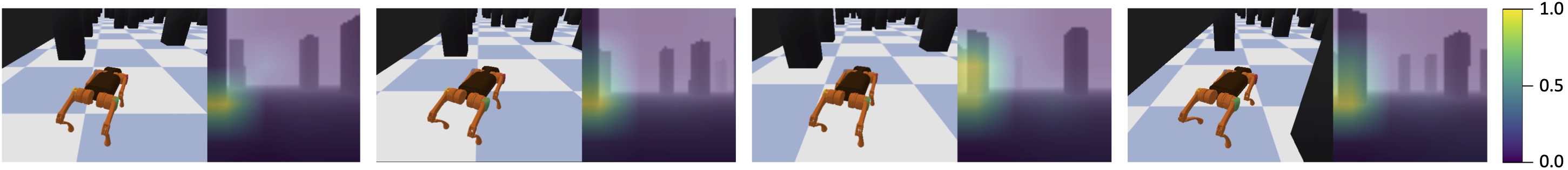 We visualize the self-attention between the proprioceptive token and all visual tokens in the last layer of our Transformer model. We plot the attention weight over raw visual input where warmer color represents larger attention weight.